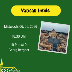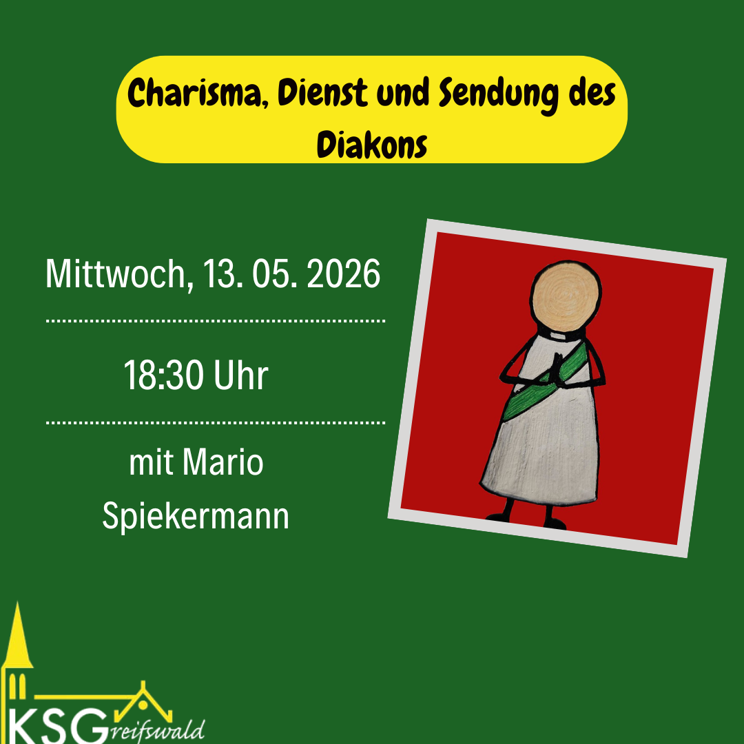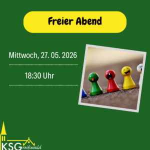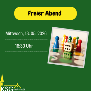 Wir treffen uns jeden Mittwoch um 18:30 Uhr in der Kirche St. Joseph zu Messe oder Gebet. Im Anschluss essen wir gemeinsam und lassen den Abend dann mit gesellschaftlichen, kirchlichen und wissenschaftlichen Themen ausklingen oder genießen einfach das Miteinander bei Kicker, Spiel und Spaß.