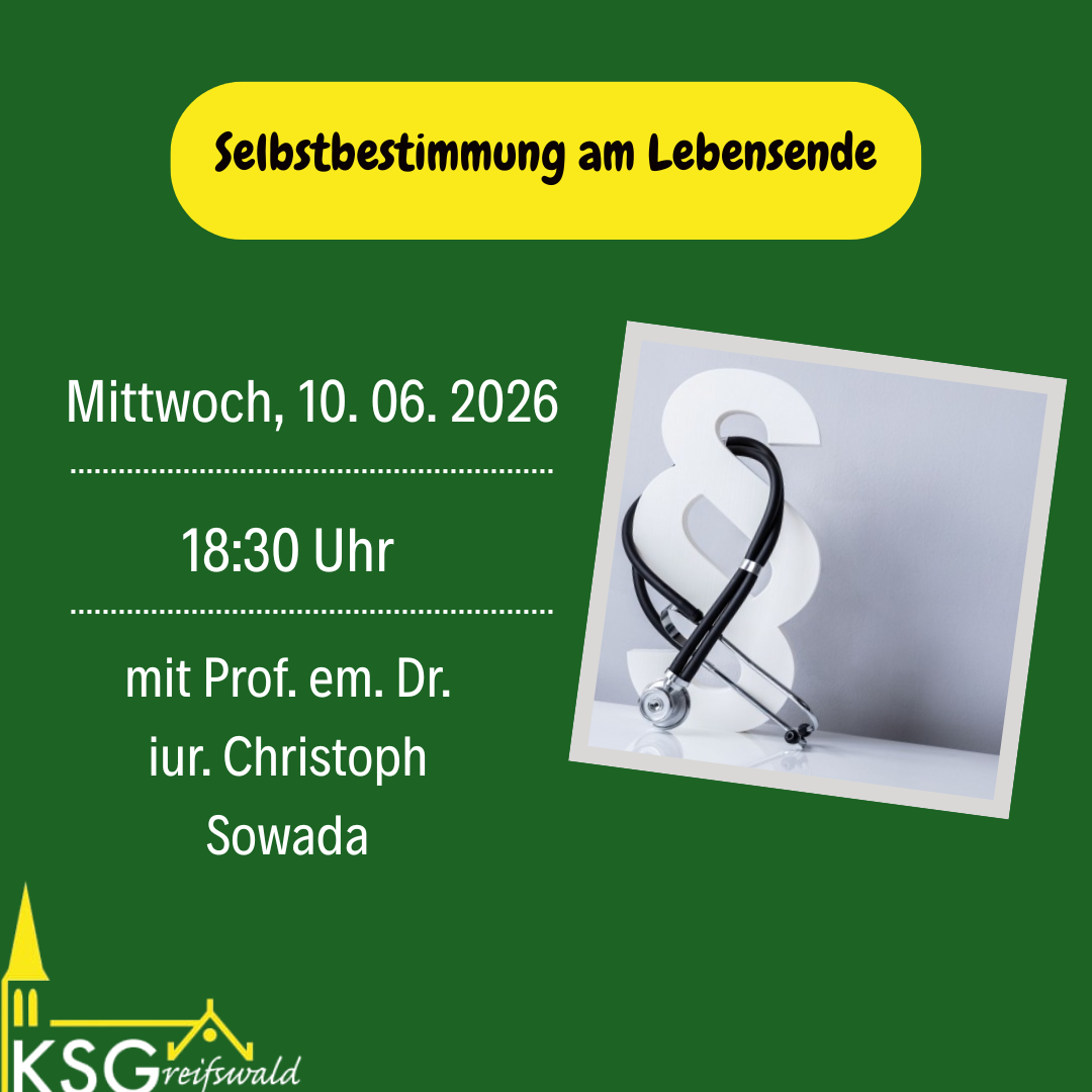Selbstbestimmung am Lebensende – (Stra-)frechtliche Aspekte mit Prof. em. Dr. iur. Christoph Sowada 10. Juni um 18:30 Uhr St. Joseph Bahnhofstr. 11-13, 17489 Greifswald